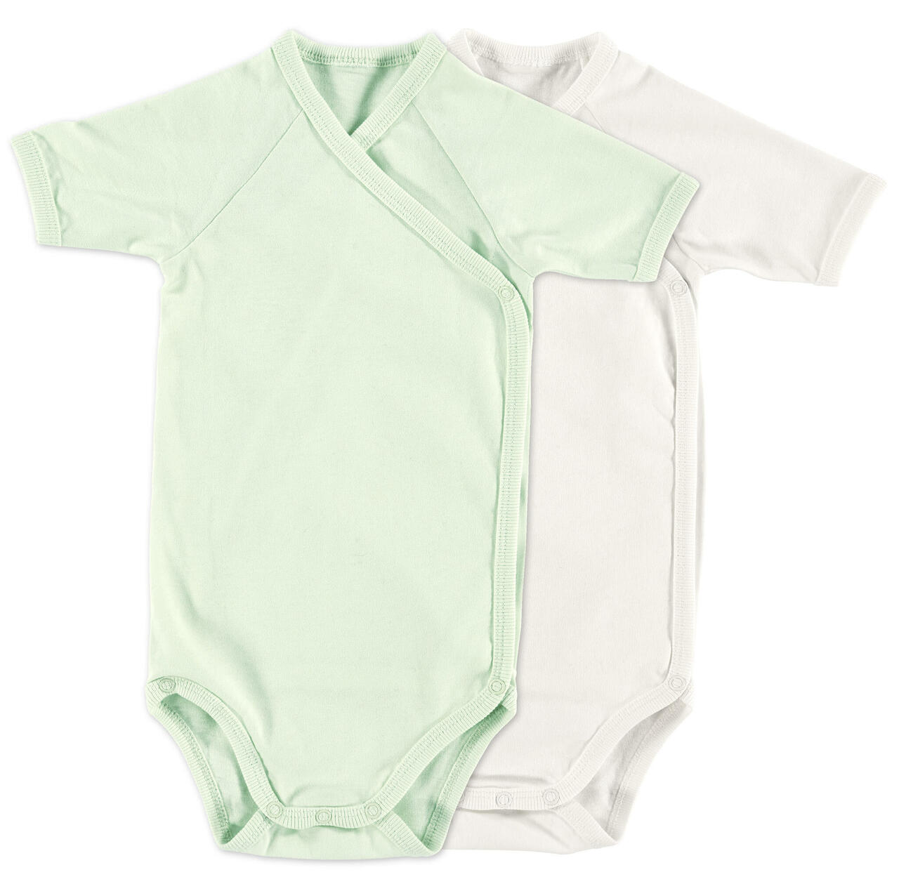 - Komplektis on kaks lühikeste varrukatega bodi - heledat münditooni ning puhas valge